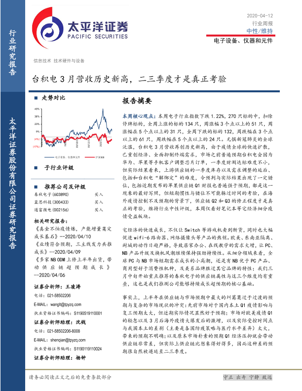 【太平洋证券】【20200412】电子设备、仪器和元件行业周报:台积电3月营收历史新高,二三季度才是真正考验-15页
