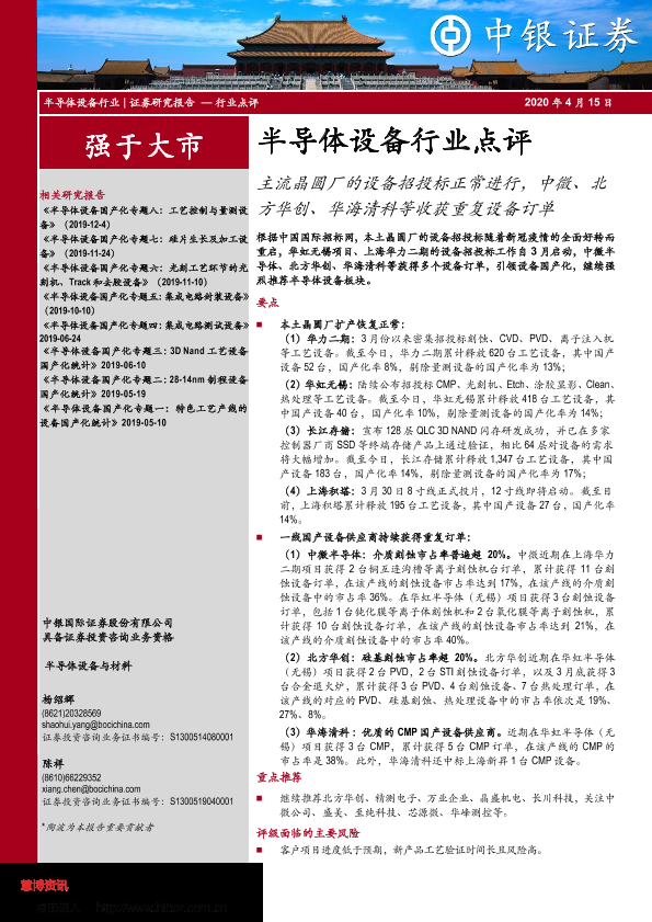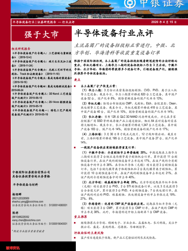 【中银证券】【20200415】20200415-中银证券-半导体设备行业点评:主流晶圆厂的设备招投标正常进行,中微、北方华创、华海清科等收获重复设备订单-4页