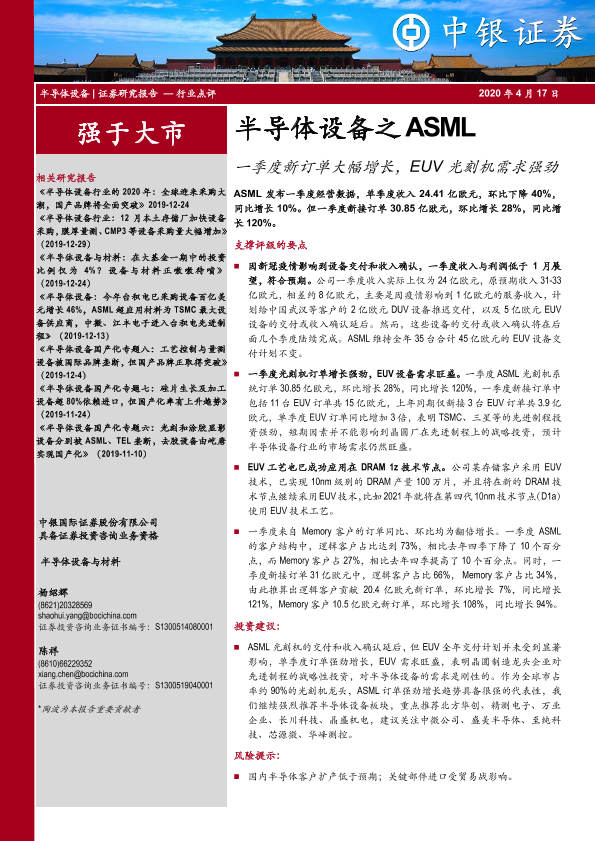 【中银证券】【20200417】半导体设备之ASML:一季度新订单大幅增长,EUV光刻机需求强劲-4页