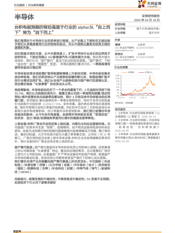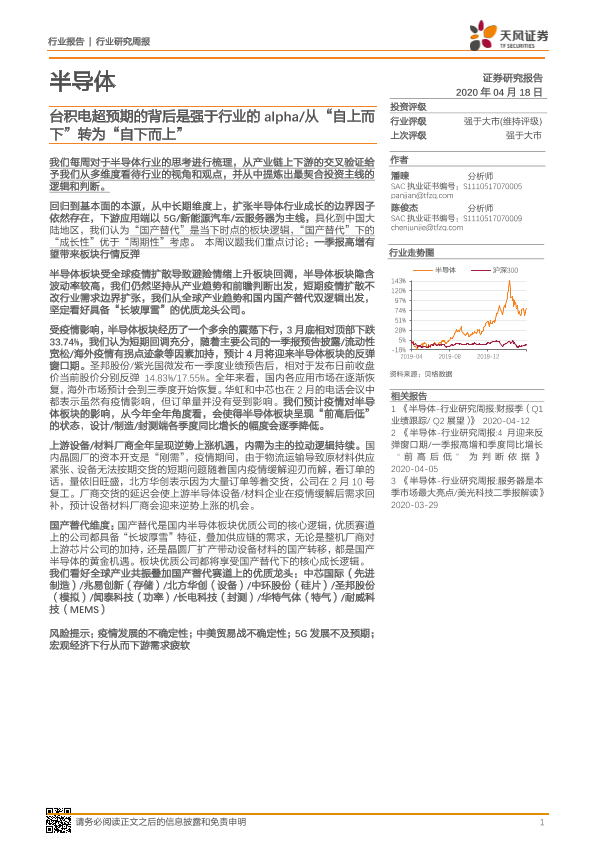 【天风证券】【20200418】20200418-天风证券-半导体行业研究周报:台积电超预期的背后是强于行业的alpha 从“自上而下”转为“自下而上”-10页