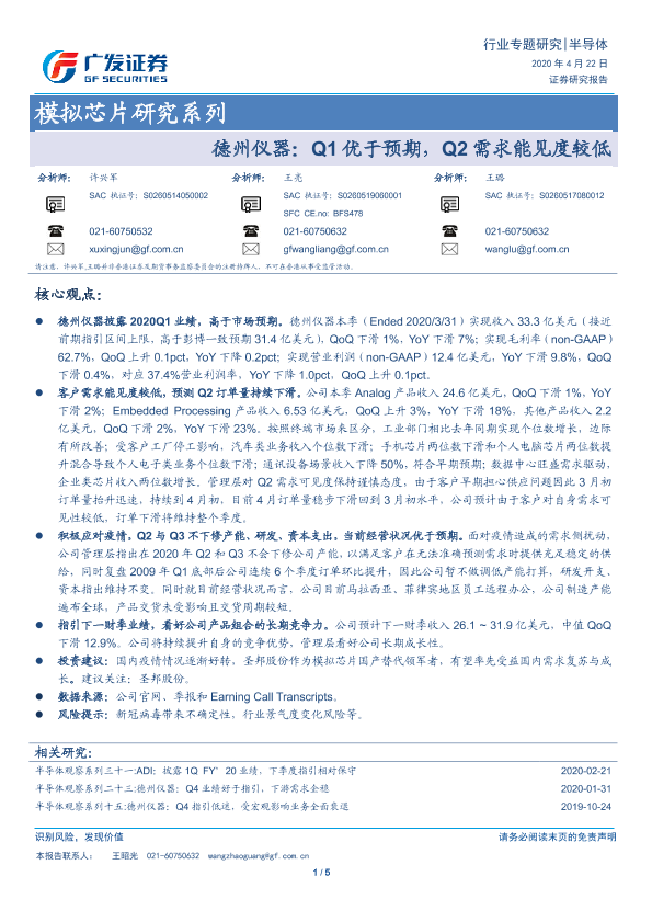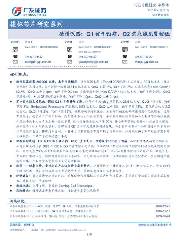 【广发证券】【20200422】20200422-广发证券-模拟芯片研究系列:德州仪器:Q1优于预期,Q2需求能见度较低-5页