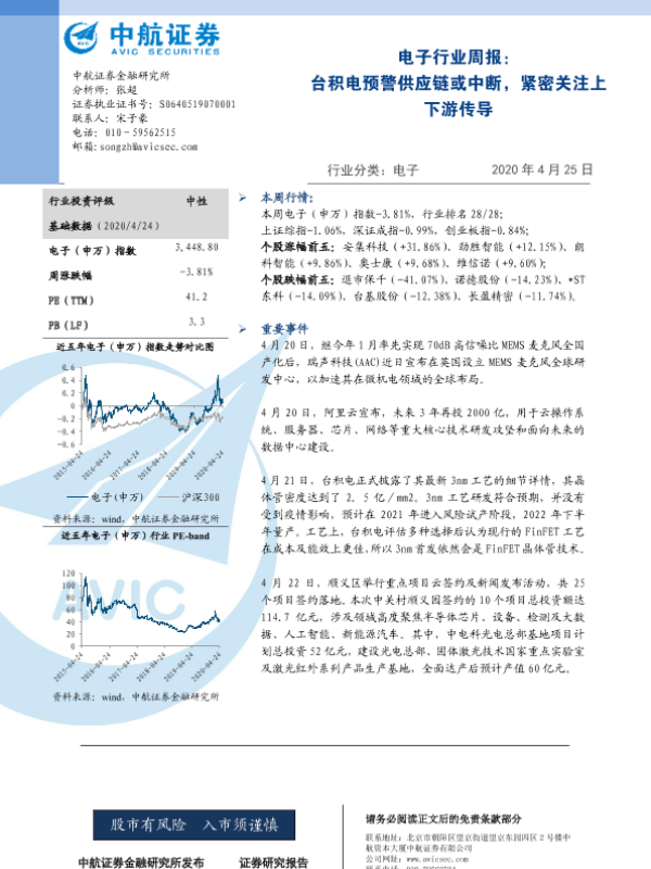 【中航证券】【20200425】电子行业周报:台积电预警供应链或中断,紧密关注上下游传导-4页