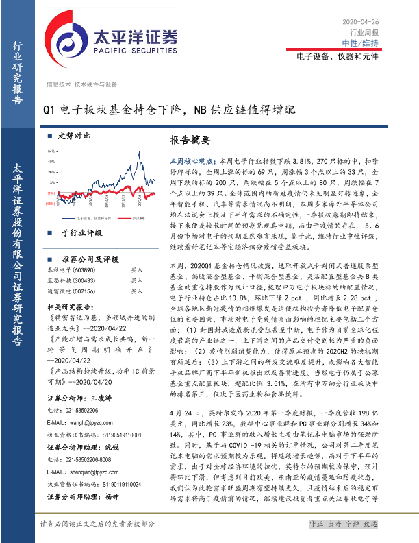 【太平洋证券】【20200426】20200426-太平洋-电子设备、仪器和元件行业周报:Q1电子板块基金持仓下降,NB供应链值得增配-14页