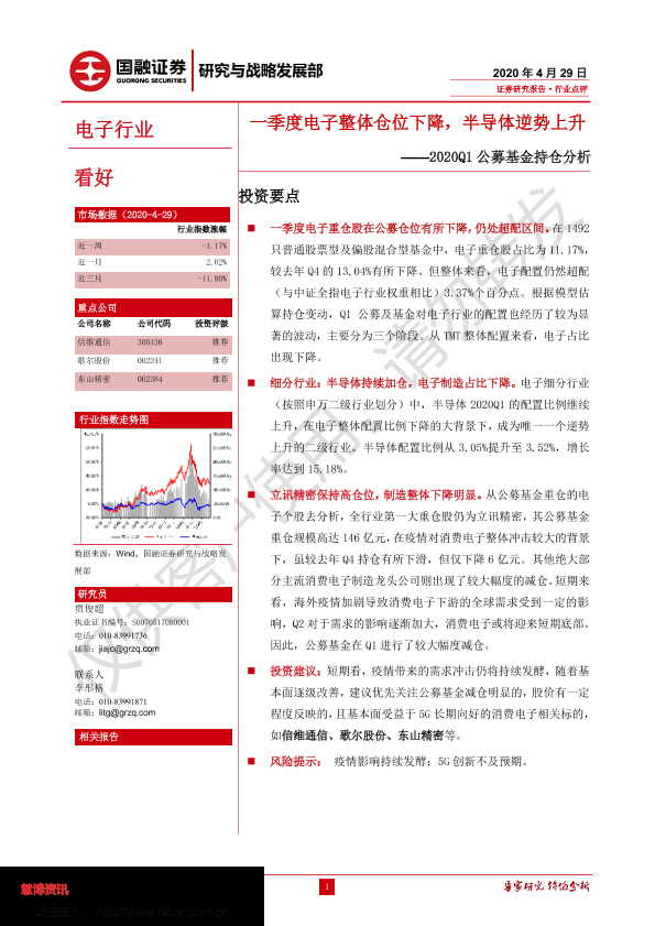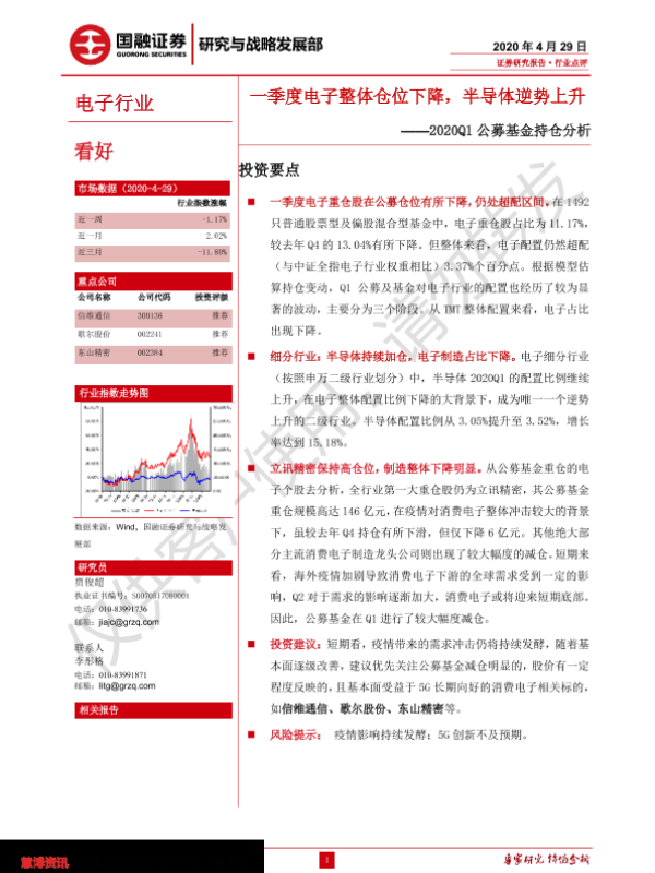 【国融证券】【20200429】电子行业2020Q1公募基金持仓分析:一季度电子整体仓位下降,半导体逆势上升-8页
