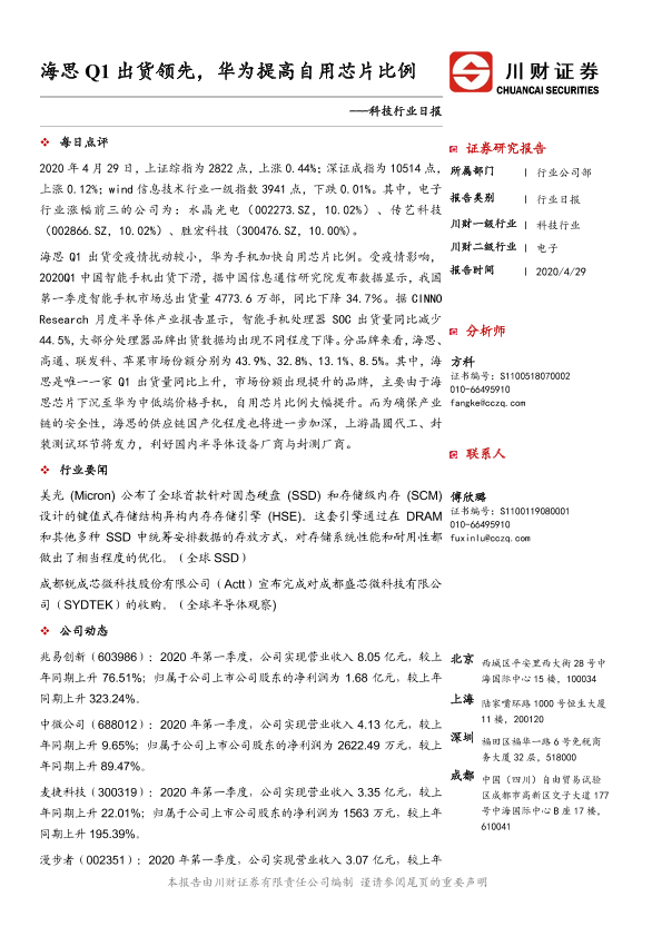 【川财证券】【20200429】科技行业日报:海思Q1出货领先,华为提高自用芯片比例-4页