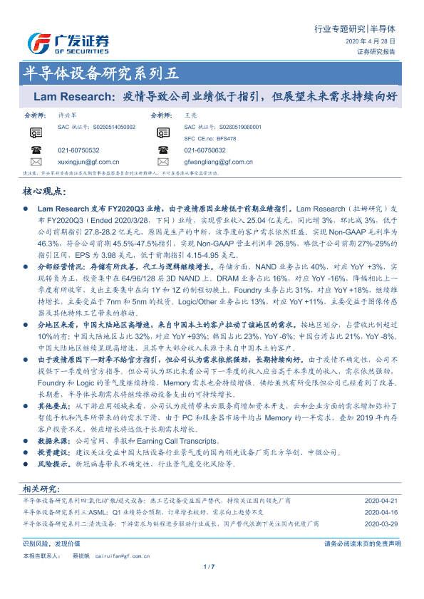 【广发证券】【20200428】Lam Research:疫情导致公司业绩低于指引,但展望未来需求持续向好-7页