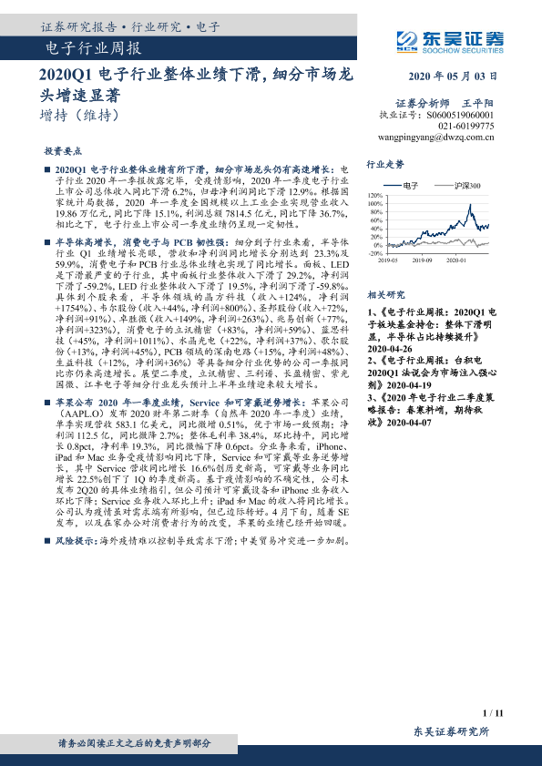 【东吴证券】【20200503】2020Q1电子行业整体业绩下滑,细分市场龙头增速显著-11页