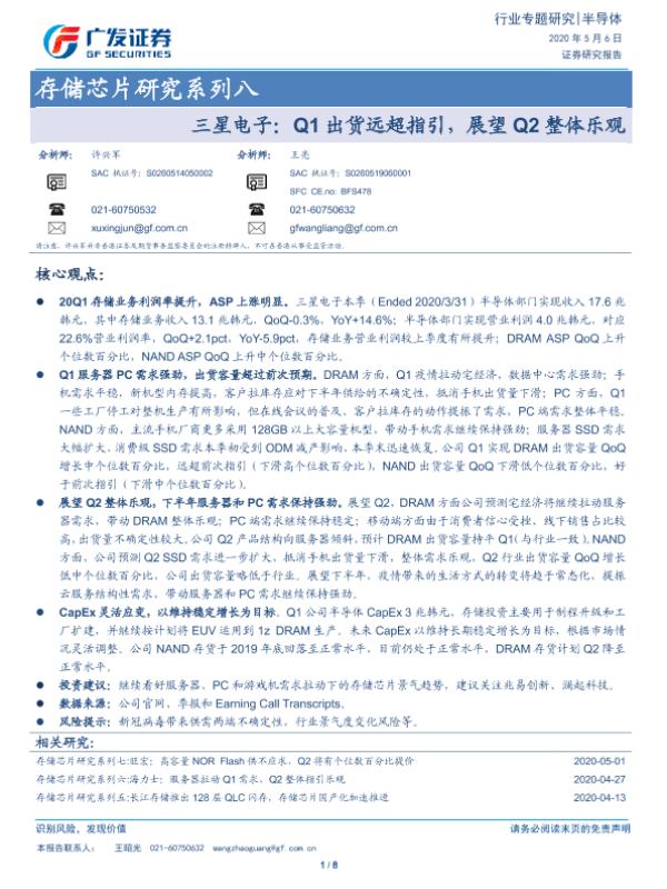 【广发证券】【20200506】存储芯片研究系列八:三星电子:Q1出货远超指引,展望Q2整体乐观-8页