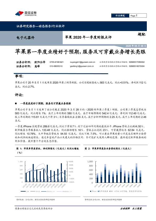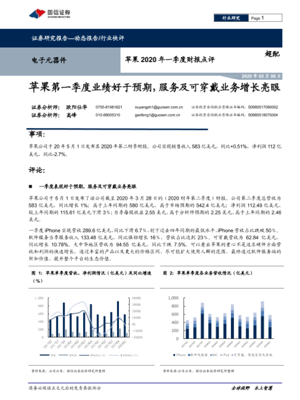 【国信证券】【20200506】苹果2020年一季度财报点评:苹果第一季度业绩好于预期,服务及可穿戴业务增长亮眼-6页