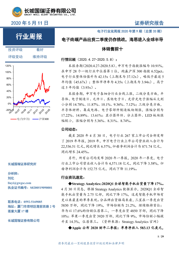 【长城国瑞证券】【20200511】电子行业双周报2020年第9期(总第33期):电子终端产品出货二季度仍存挑战,海思进入全球半导体销售前十-29页