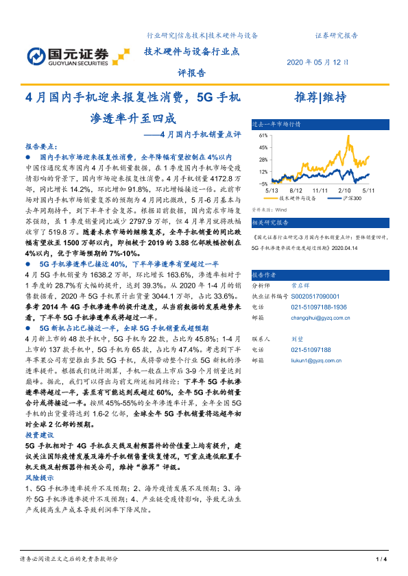 【国元证券】【20200512】4月国内手机销量点评:4月国内手机迎来报复性消费,5G手机渗透率升至四成-4页