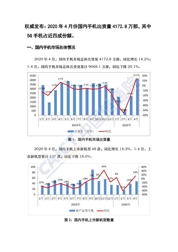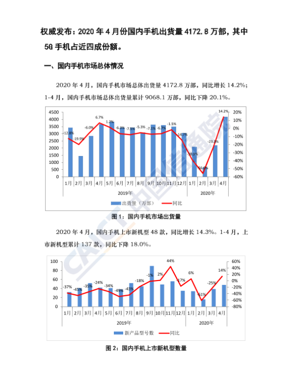 【中国信通院】【20200512】2020年4月份国内手机出货量4172.8万部,其中5G手机占近四成份额-3页