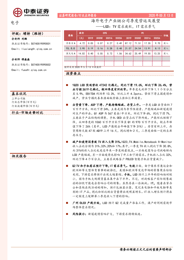 【中泰证券】【20200513】海外电子产业链公司季度营运及展望——LGD:TV需求疲软,IT需求景气-7页