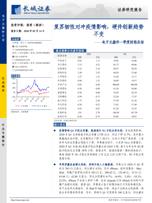 【长城证券】【20200514】电子元器件一季度财报总结:复苏韧性对冲疫情影响,硬件创新趋势不变-39页