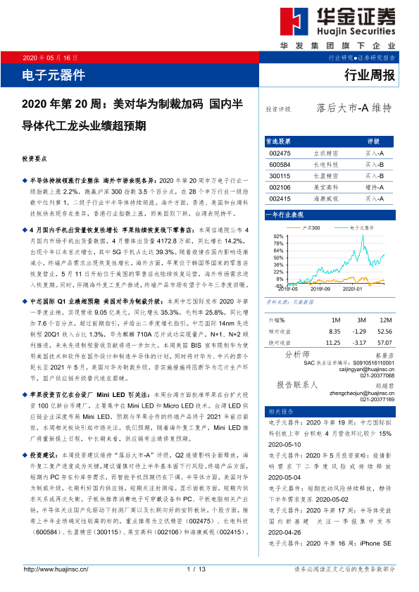 【华金证券】【20200516】2020年第20周:美对华为制裁加码 国内半导体代工龙头业绩超预期-13页