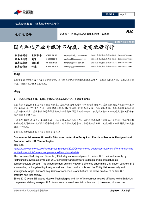 【国信证券】【20200517】电子元器件点评5月15日华为被美国商务部进一步限制:国内科技产业升级时不待我,更需砥砺前行-11页