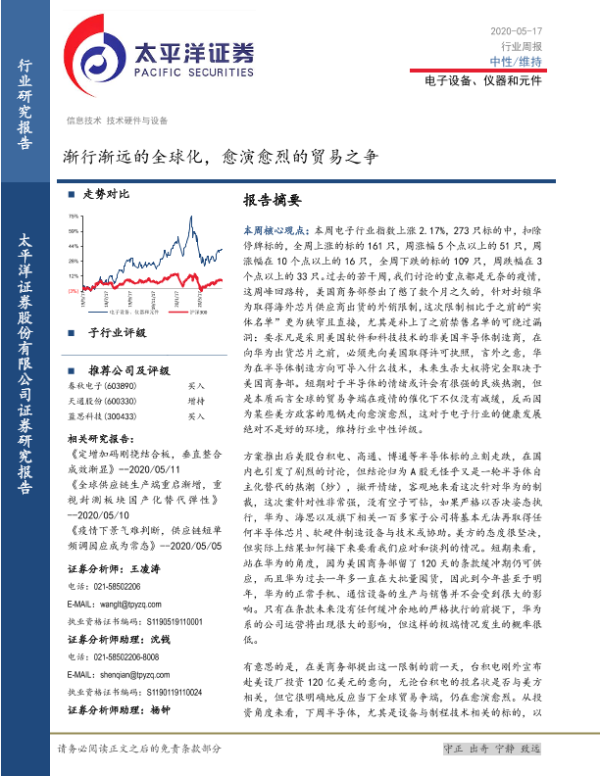 【太平洋证券】【20200517】20200517-太平洋-电子设备、仪器和元件行业周报:渐行渐远的全球化,愈演愈烈的贸易之争-13页