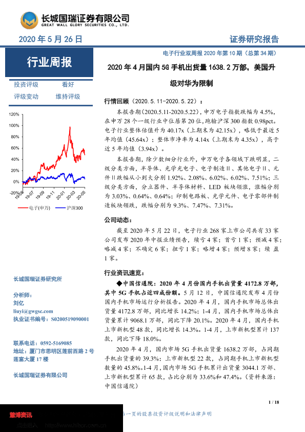 【长城国瑞证券】【20200526】电子行业双周报2020年第10期(总第34期):2020年4月国内5G手机出货量1638.2万部,美国升级对华为限制-18页