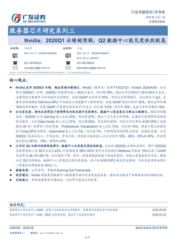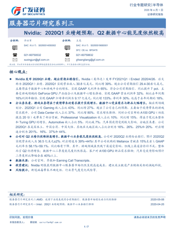 【广发证券】【20200601】Nvidia:2020Q1业绩超预期,Q2数据中心能见度依然较高-7页