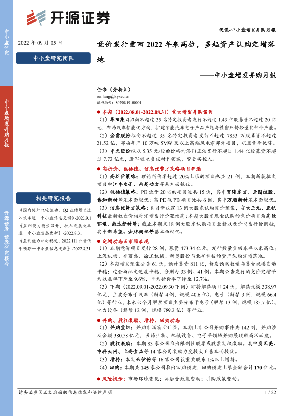 【开源证券】【20220905】中小盘增发并购月报:竞价发行重回2022年来高位,多起资产认购定增落地-22页