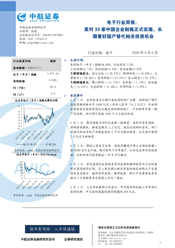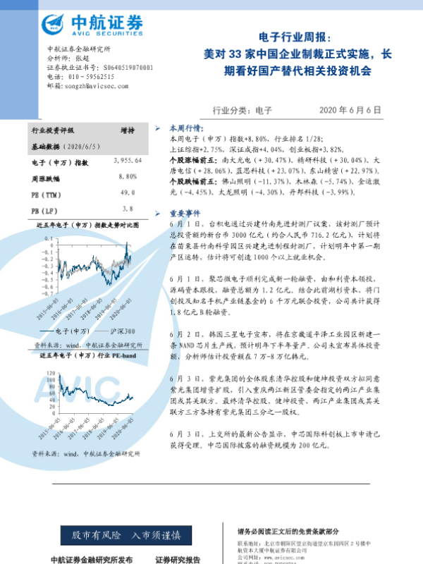 【中航证券】【20200606】电子行业周报:美对33家中国企业制裁正式实施,长期看好国产替代相关投资机会-4页