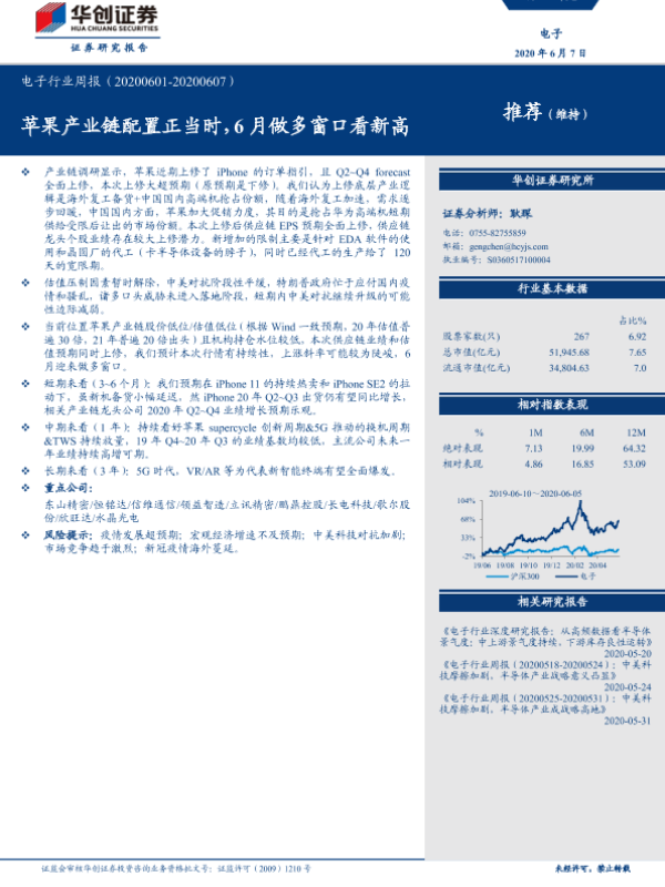 【华创证券】【20200607】20200607-华创证券-电子行业周报:苹果产业链配置正当时,6月做多窗口看新高-21页