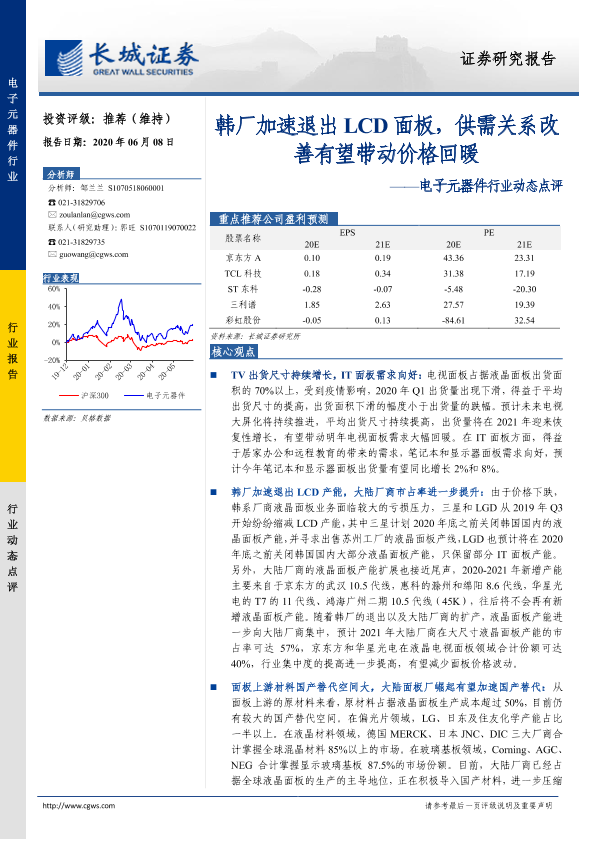 【长城证券】【20200608】电子元器件行业动态点评:韩厂加速退出LCD面板,供需关系改善有望带动价格回暖-16页