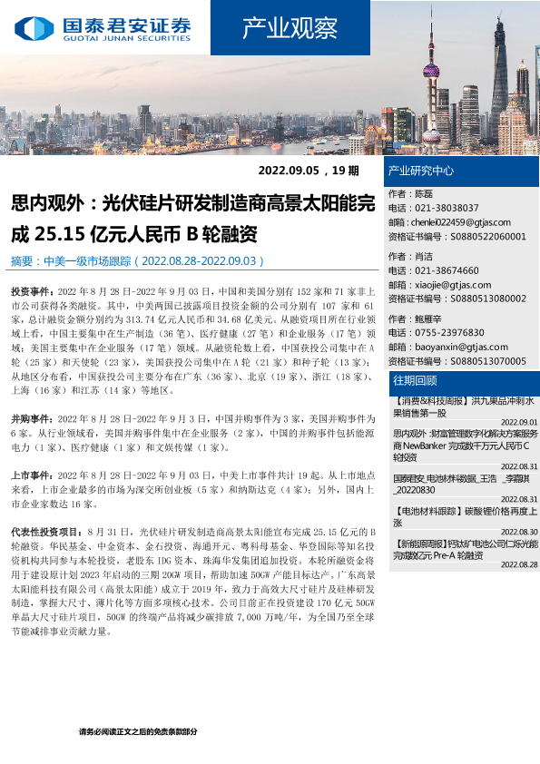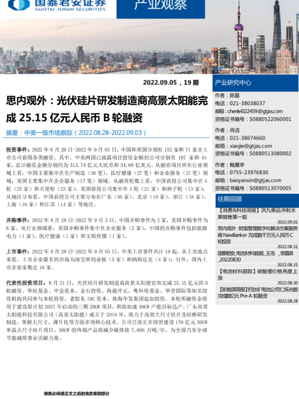 【国泰君安证券】【20220905】产业观察19期:思内观外,光伏硅片研发制造商高景太阳能完成25.15亿元人民币B轮融资-23页