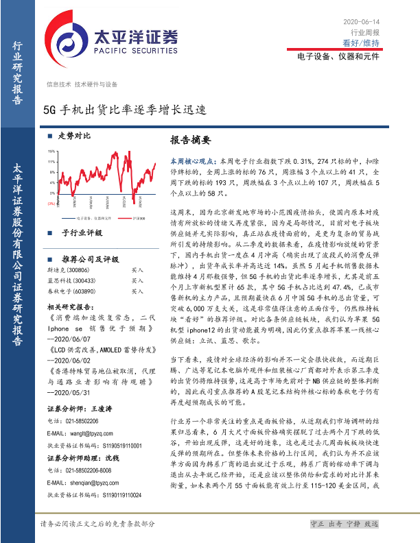 【太平洋证券】【20200614】电子设备、仪器和元件行业周报:5G手机出货比率逐季增长迅速-14页