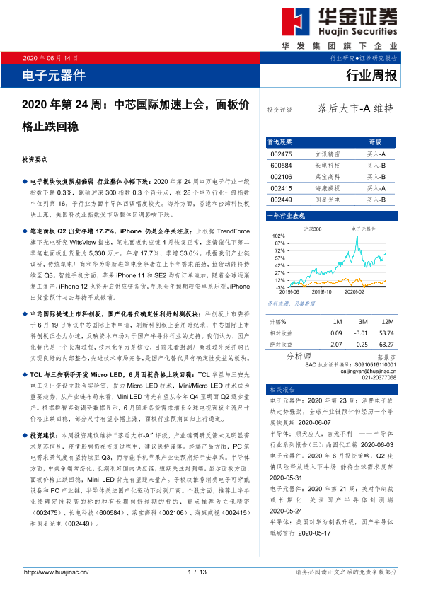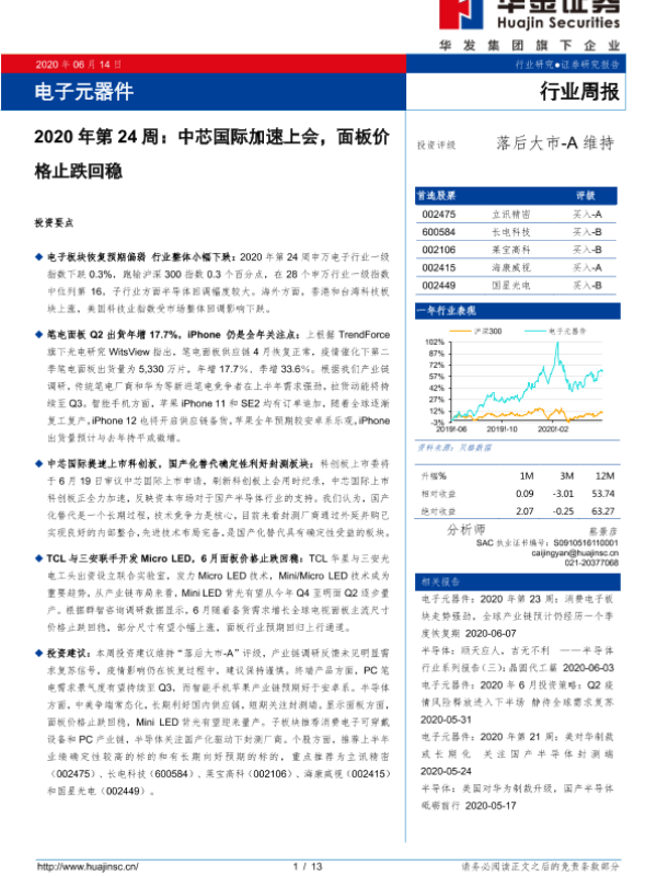 【华金证券】【20200614】电子元器件2020年第24周:中芯国际加速上会,面板价格止跌回稳-13页