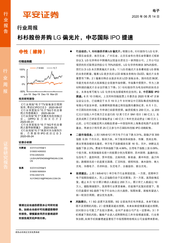 【平安证券】【20200614】电子行业周报:杉杉股份并购LG偏光片,中芯国际IPO提速-5页