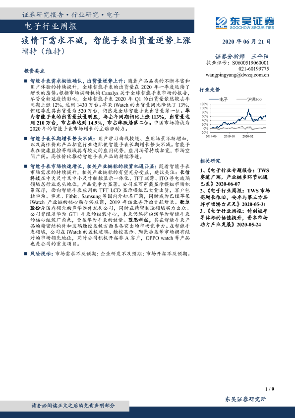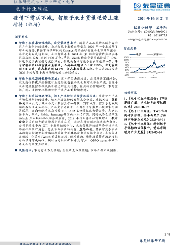 【东吴证券】【20200621】电子行业周报:疫情下需求不减,智能手表出货量逆势上涨-9页