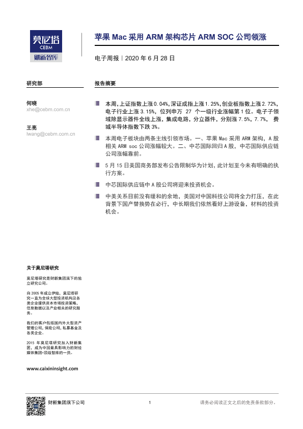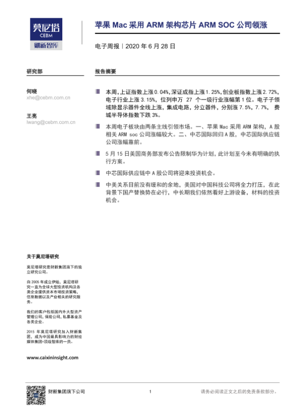 【莫尼塔研究】【20200628】20200628-莫尼塔投资-电子周报:苹果Mac采用ARM架构芯片ARM SOC公司领涨-9页