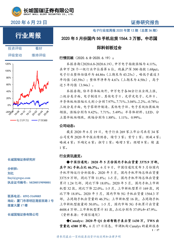 【长城国瑞证券】【20200623】2020年5月份国内5G手机出货1564.3万部,中芯国际科创板过会-17页