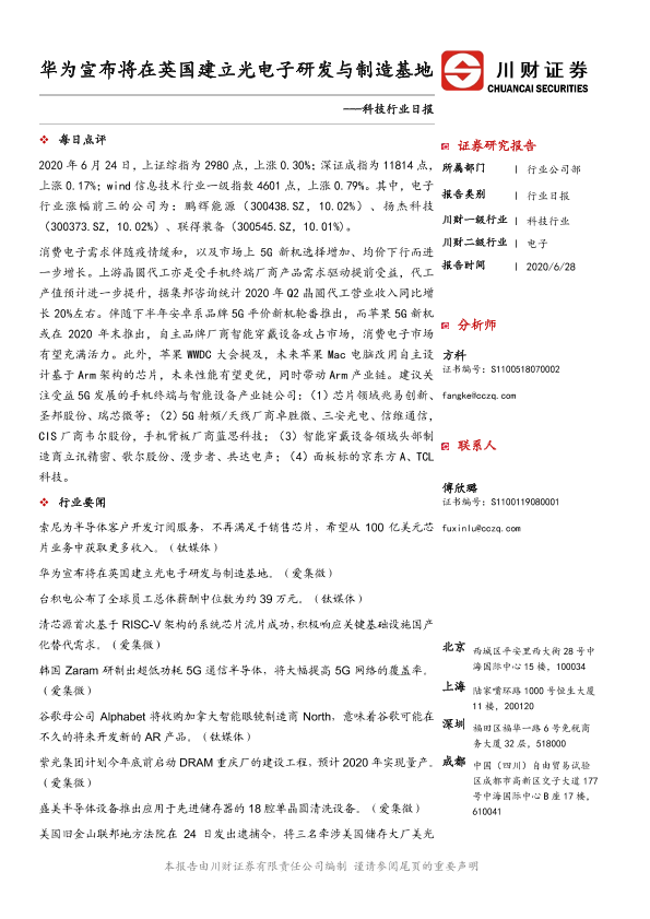【川财证券】【20200628】科技行业日报:华为宣布将在英国建立光电子研发与制造基地-4页