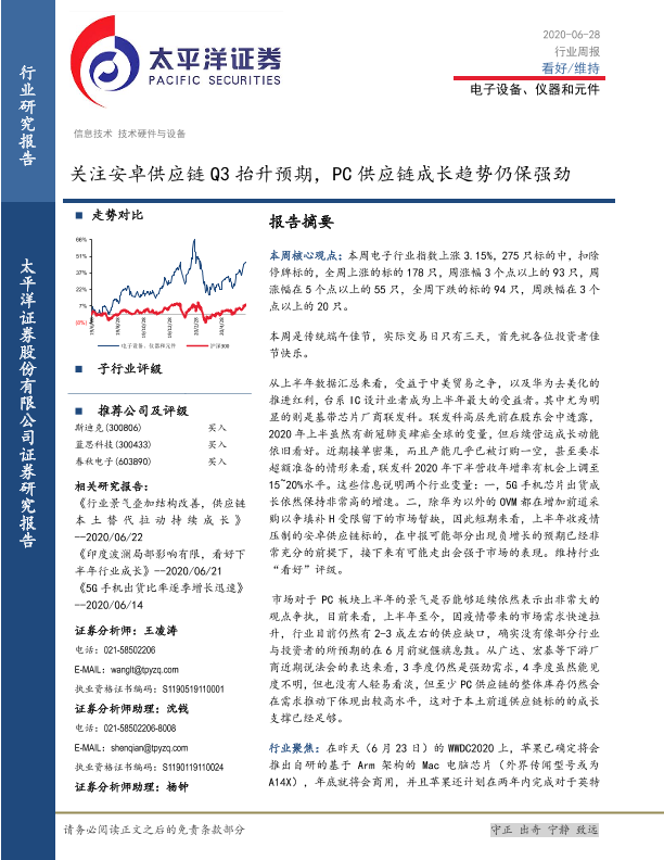 【太平洋证券】【20200628】20200628-太平洋-电子设备、仪器和元件行业周报:关注安卓供应链Q3抬升预期,PC供应链成长趋势仍保强劲-14页