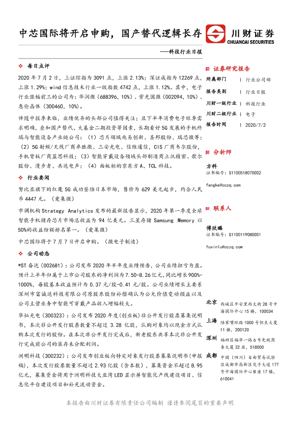 【川财证券】【20200702】科技行业日报:中芯国际将开启申购,国产替代逻辑长存-4页