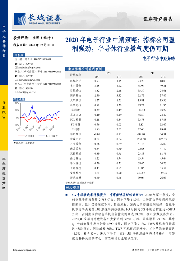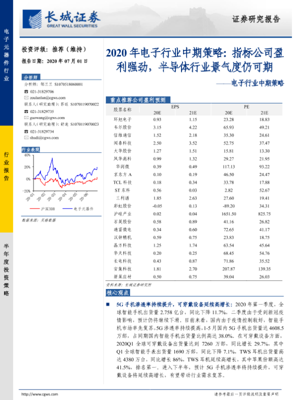 【长城证券】【20200701】2020年电子行业中期策略:指标公司盈利强劲,半导体行业景气度仍可期-21页