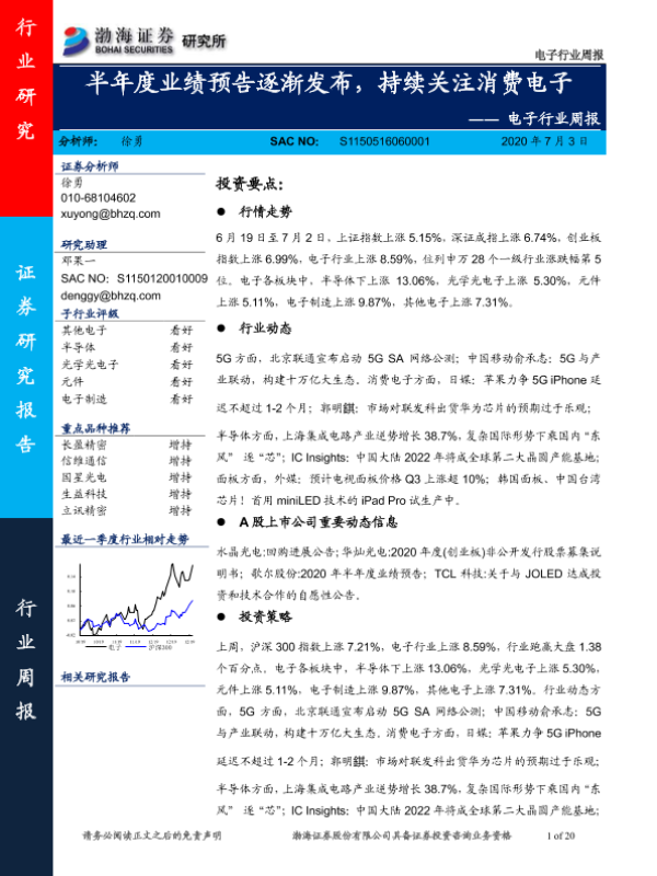 【渤海证券】【20200703】20200703-渤海证券-电子行业周报:半年度业绩预告逐渐发布,持续关注消费电子-20页