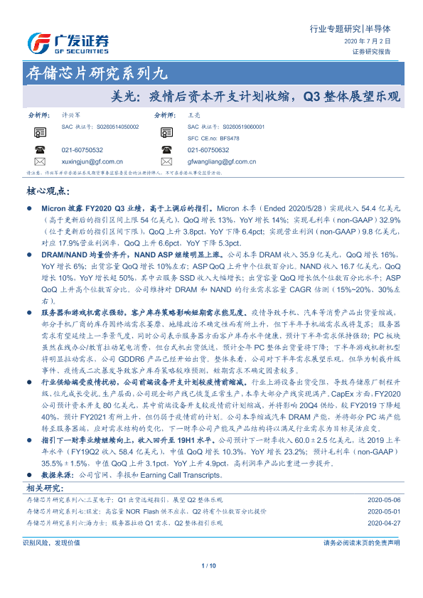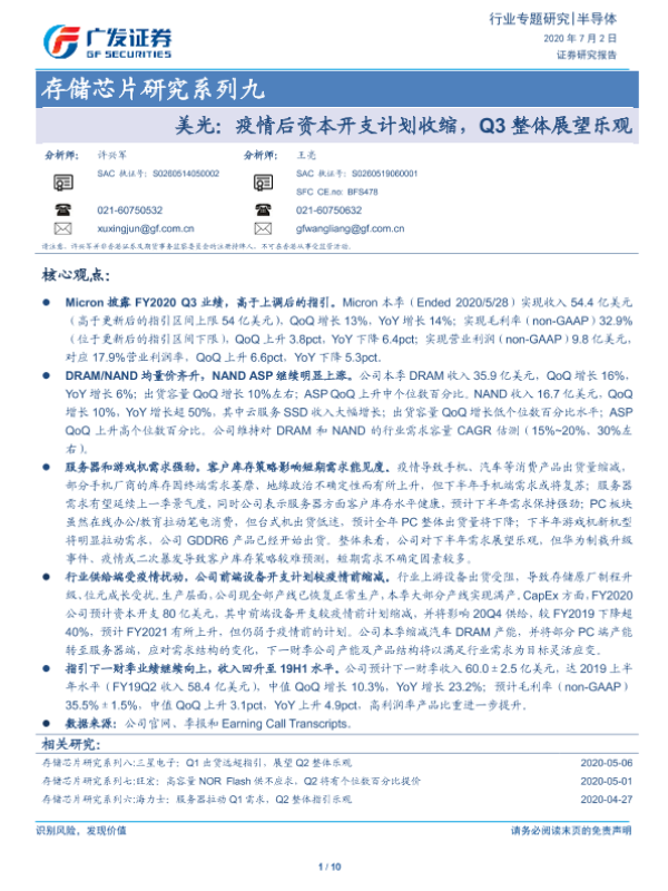 【广发证券】【20200702】美光:疫情后资本开支计划收缩,Q3整体展望乐观-10页
