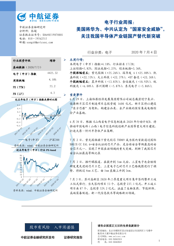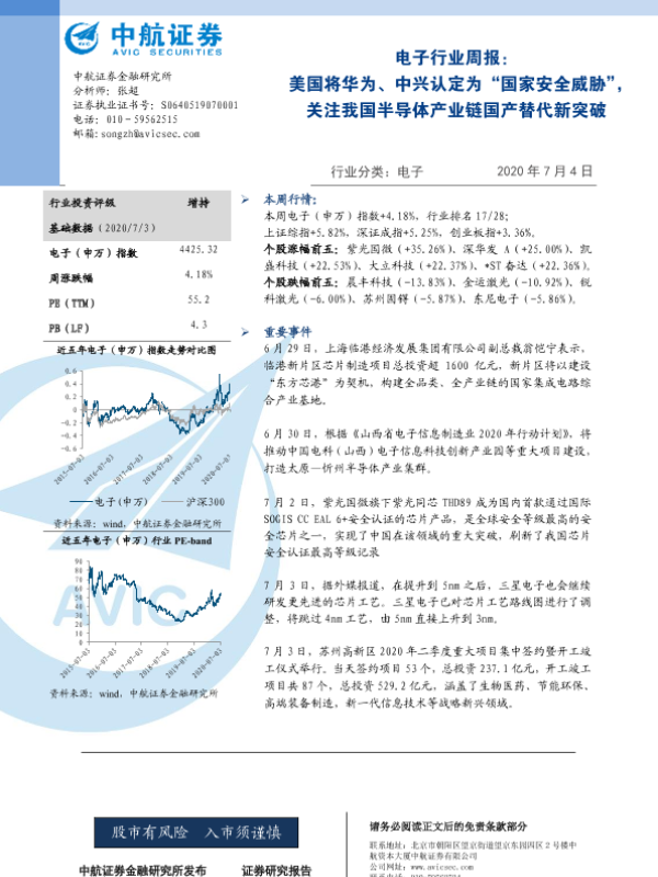 【中航证券】【20200704】电子行业周报:美国将华为、中兴认定为“国家安全威胁”,关注我国半导体产业链国产替代新突破-5页
