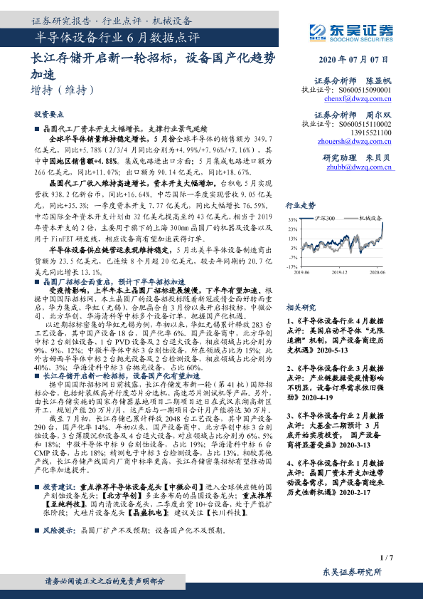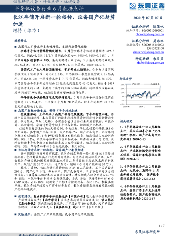 【东吴证券】【20200707】半导体设备行业6月数据点评:长江存储开启新一轮招标,下半年设备国产化趋势加速-7页