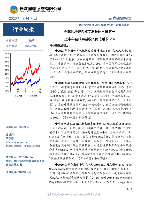 【长城国瑞证券】【20200707】TMT行业周报2020年第19期(总第103期):全球区块链授权专利数阿里排第一 上半年全球手游收入同比增长21%-19页