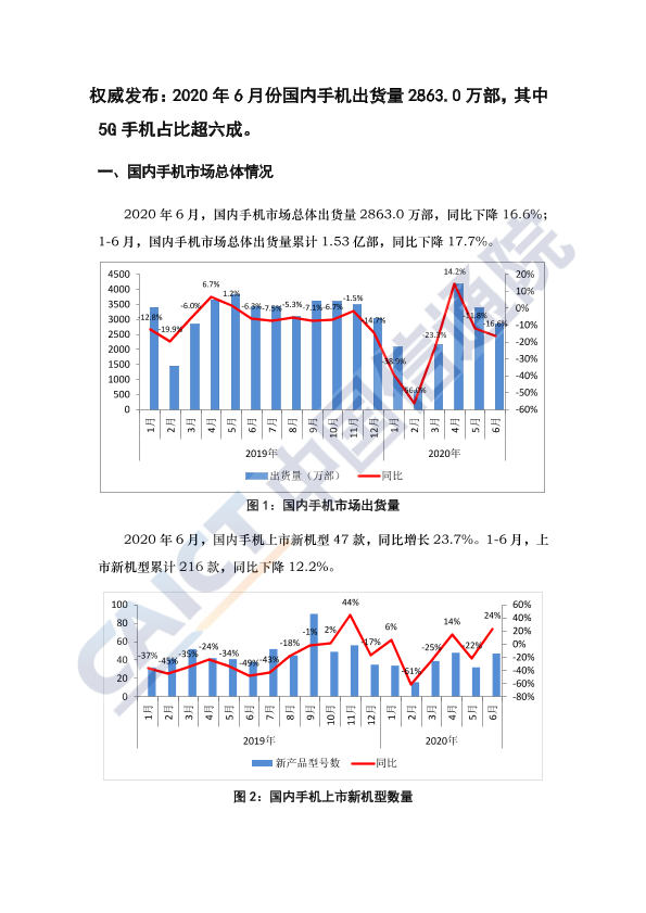 【中国信通院】【20200711】2020年6月份国内手机出货量2863.0万部,其中5G手机占比超六成-3页