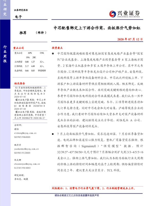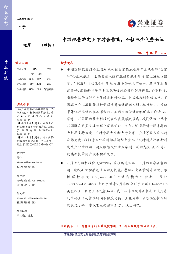 【兴业证券】【20200712】20200712-兴业证券-电子行业周报:中芯配售绑定上下游合作商,面板涨价气势如虹-9页