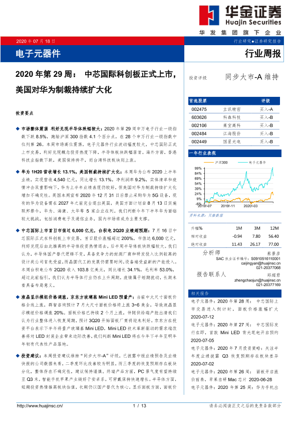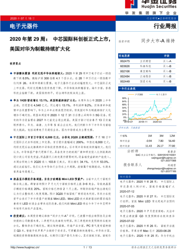 【华金证券】【20200718】电子元器件2020年第29周:中芯国际科创板正式上市,美国对华为制裁持续扩大化-13页