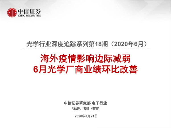 【中信证券】【20200721】光学行业深度追踪系列第18期(2020年6月):海外疫情影响边际减弱 6月光学厂商业绩环比改善-21页