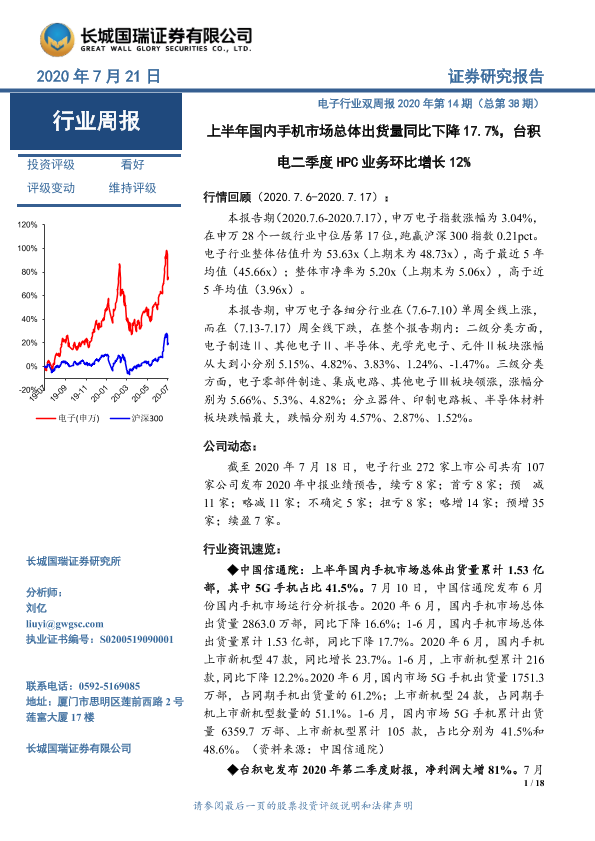 【长城国瑞证券】【20200721】电子行业双周报2020年第14期(总第38期):上半年国内手机市场总体出货量同比下降17.7%,台积电二季度HPC业务环比增长12%-18页