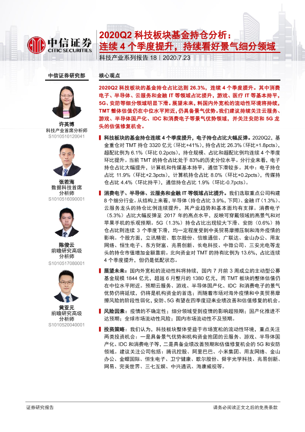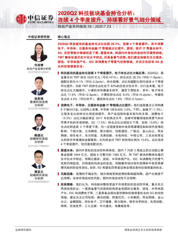 【中信证券】【20200723】2020Q2科技板块基金持仓分析:连续4个季度提升,持续看好景气细分领域-17页