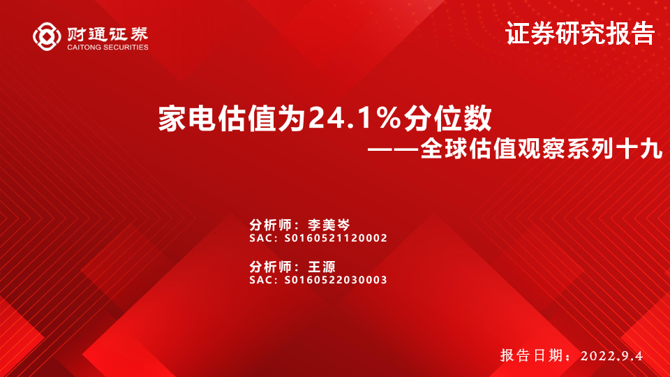 【财通证券】【20220904】全球估值观察系列十九:家电估值为24.1%分位数-29页
